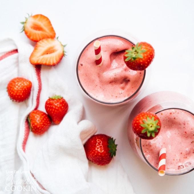 A classic strawberry smoothie made with frozen berries, honey, vanilla, and milk. A healthy and delicious breakfast on the go!