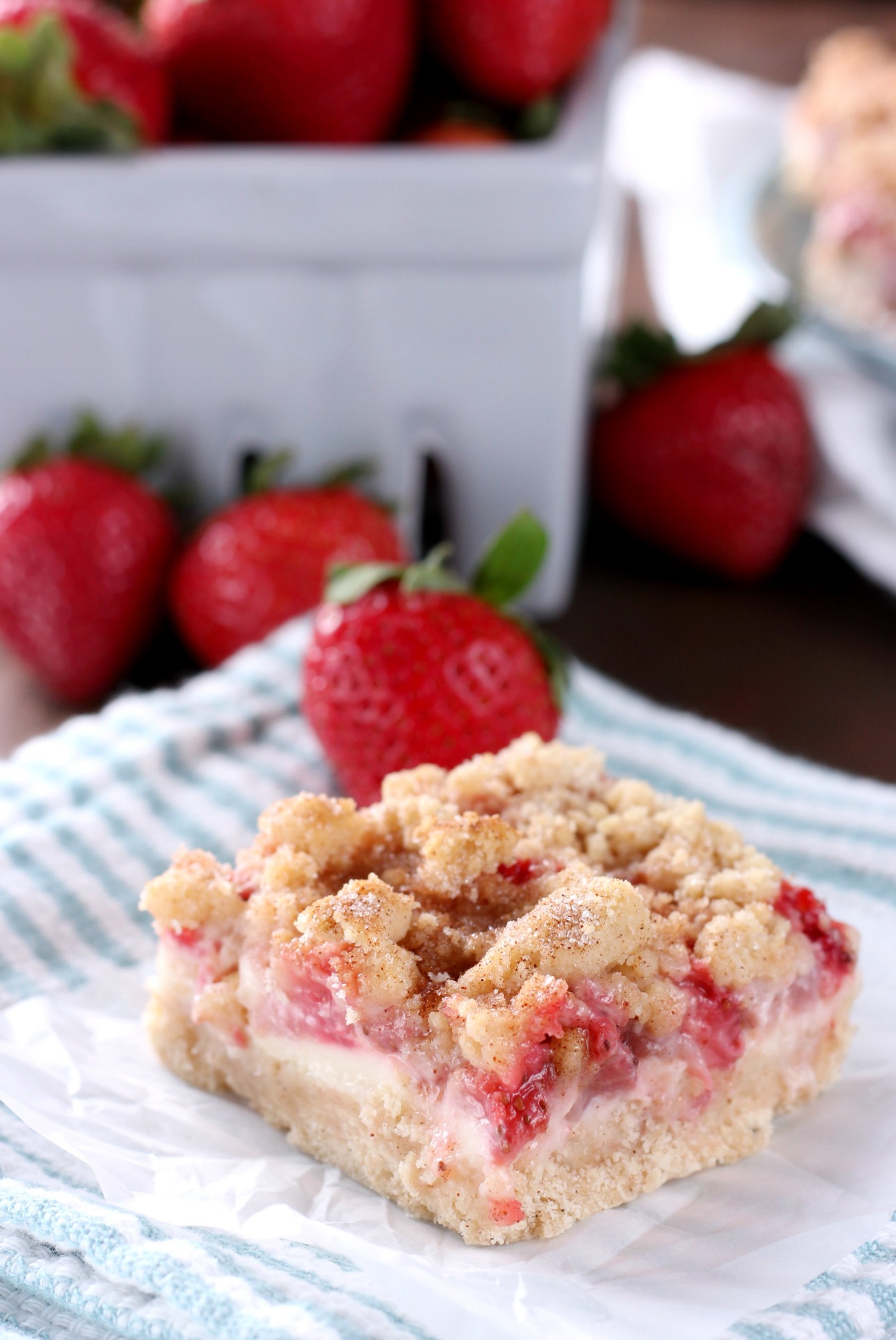 Sweet, summer strawberries and creamy cheesecake are sandwiched between layers of snickerdoodle cookies to create these irresistible Strawberry Snickerdoodle Cheesecake Bars!