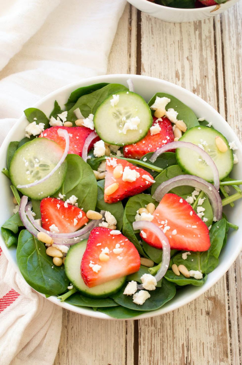 Top with red onion, strawberries, cucumber, pine nuts and feta cheese.