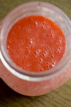 - Remove the green tops off of the strawberries. and place them in a blender.