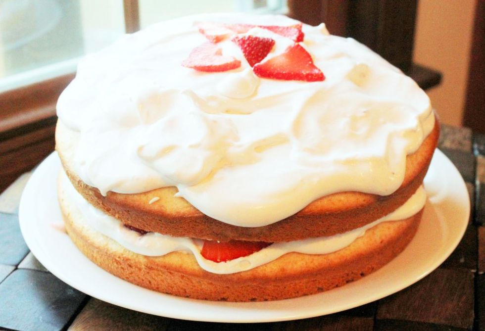 9. Place other layer of cake over topping, flat side up. Top with remaining topping and remaining strawberries.