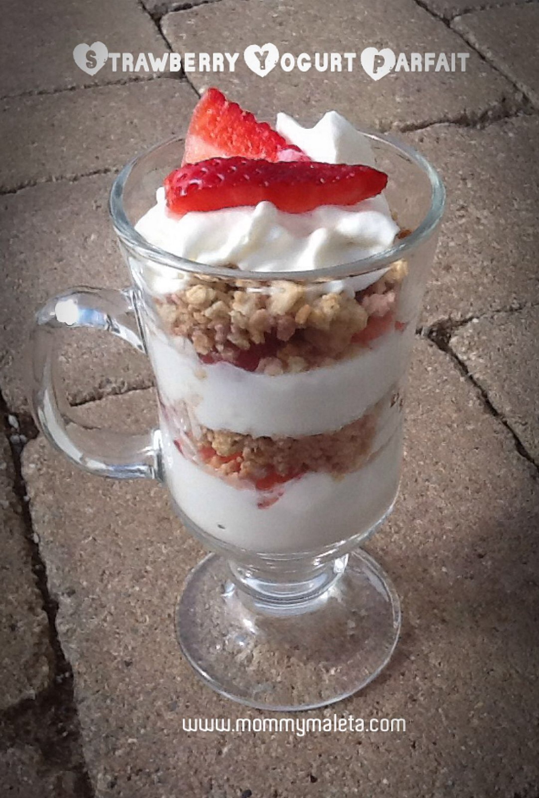 Layer yogurt, strawberries & granola twice in a pretty glass dessert dish or mug. Top with whipped cream & a sliced berry or two.