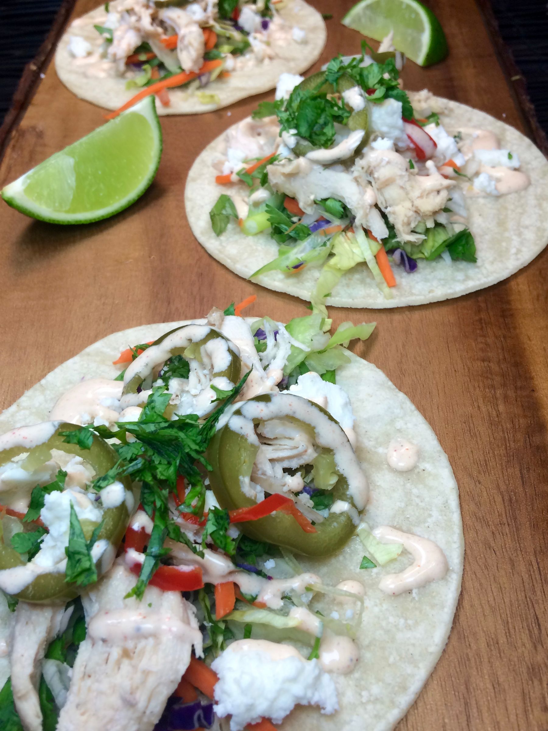 My homemade Street Tacos are filled with shredded chicken, cabbage, carrot, cilantro, lime, Queso Fresco cheese, my homemade pickled Jalapeños and a drizzle of my Chipotle Crema. They are so incredibly flavorful from all the fresh ingredients. I bet you can\\\'t just eat one!!