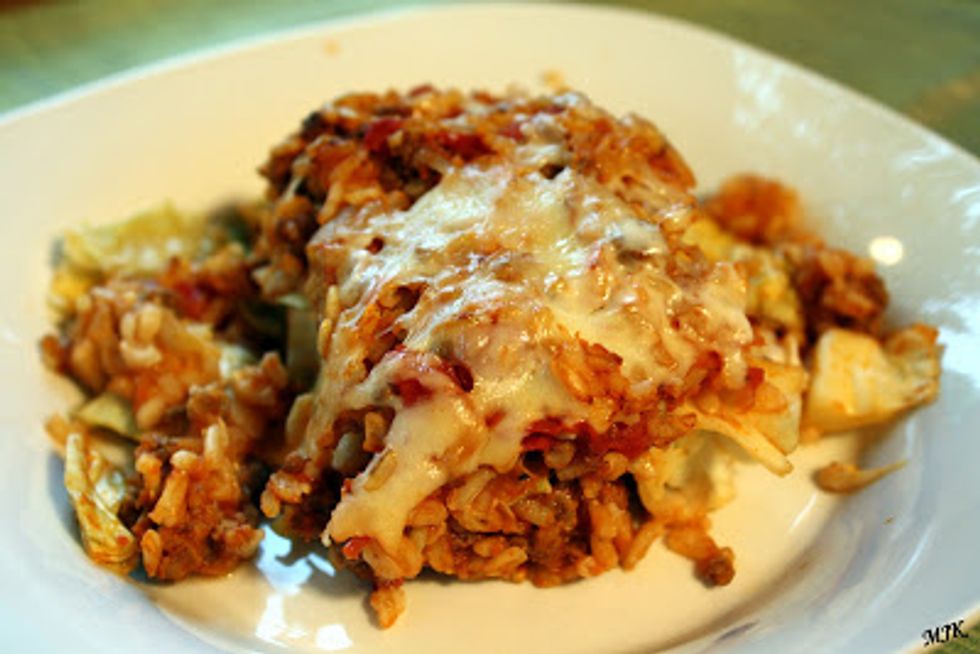 When I was in Romania, I was served a lot of traditional Romanian foods. My favorites were mici (sausages) and sarmales, which are stuffed cabbage rolls. They are absolutely delicious and I've never had anything as good in the states. I came across this recipe for stuffed cabbage casserole and I thought it looked and sounded delicious. It also looked like it would take a lot less time to make than stuffed cabbage rolls. I was right--it was very easy to put together. It doesn't t
