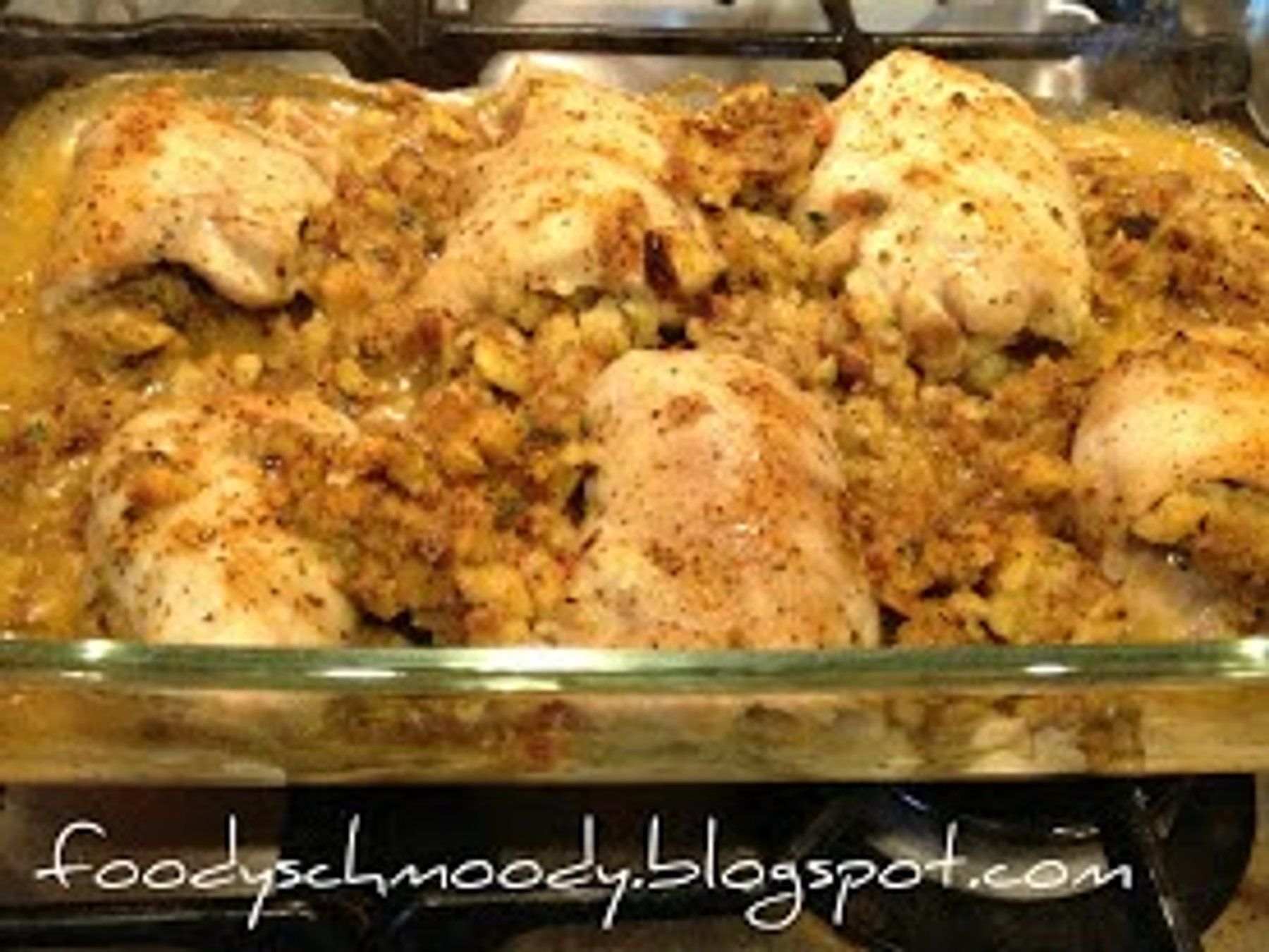 Lie each thigh upside down and place a scoop of stuffing in the middle, roll up as best as you can and place seam side down in a 9x13 baking dish. (If you have stuffing left at this...