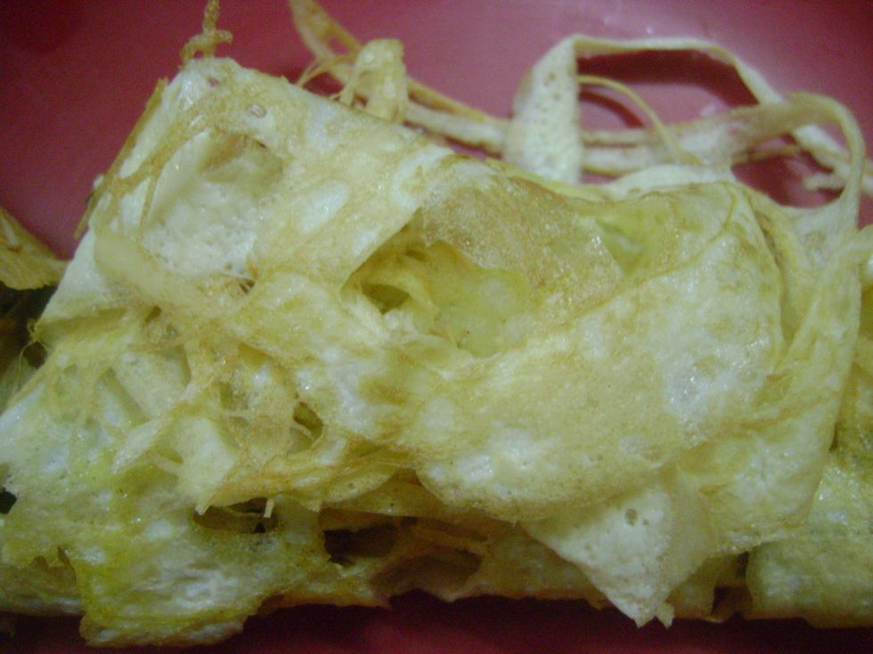 Method:- for the stuffing heat oil in a medium frying pan over a high heat, add chopped garlic and onion and fry for 2 minutes, add the cottage cheese and fry for another 1 minute, your stuffing is ready. For EGG NET, whisk egg in a bowl,strain mixture in fine sheave and season with paper and salt. Place a frying pan over a medium heat, pour the egg in thin streams making a lattice pattern. Gently cook for 30 to 40 seconds or egg net is cooked through. Turn out on to a sheet of baking paper, spoon the cottage cheese stuffing down the center of the net and arrange the coriander on top. Gently roll to encase.