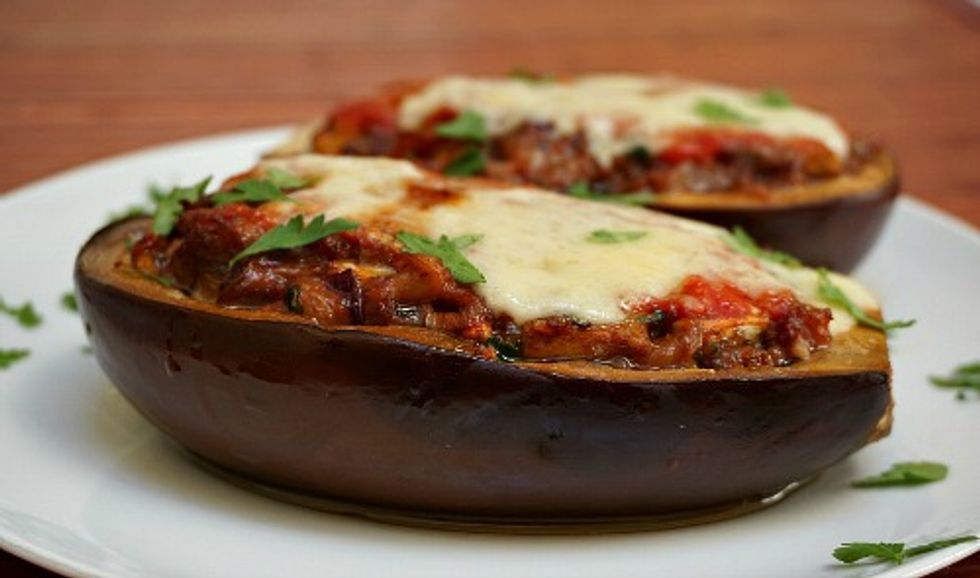 Eggplant (or Aubergine) stuffed with sausage and provolone cheese. An easy and versatile Italian recipe.