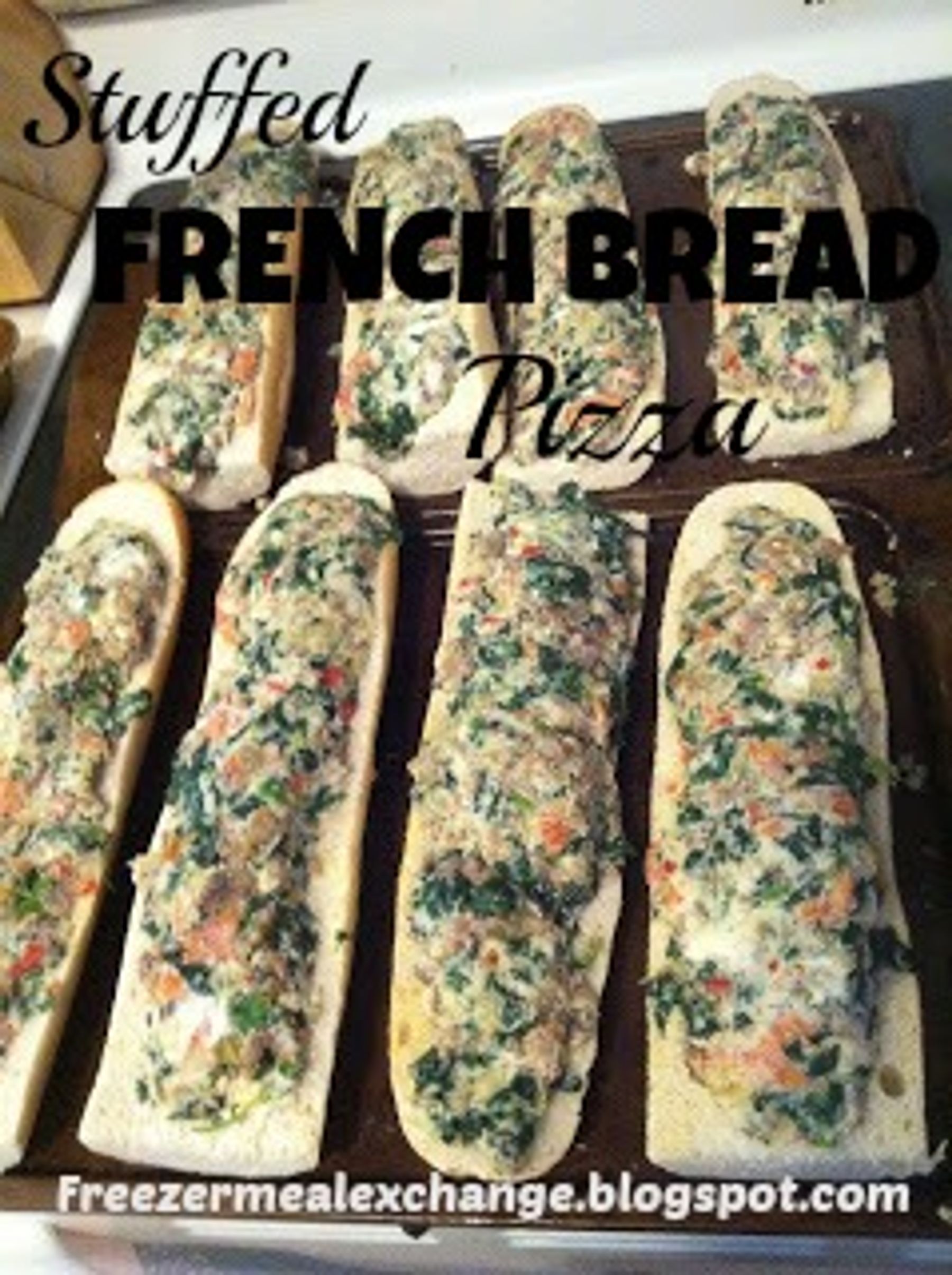 This Rachel Ray-inspired French Bread pizza makes a hearty meal for your family. Stuffed with sausage, spinach and ricotta, it's sure to please. Assemble these in advance and freeze. Defrost and bake for a quick and tasty dinner.