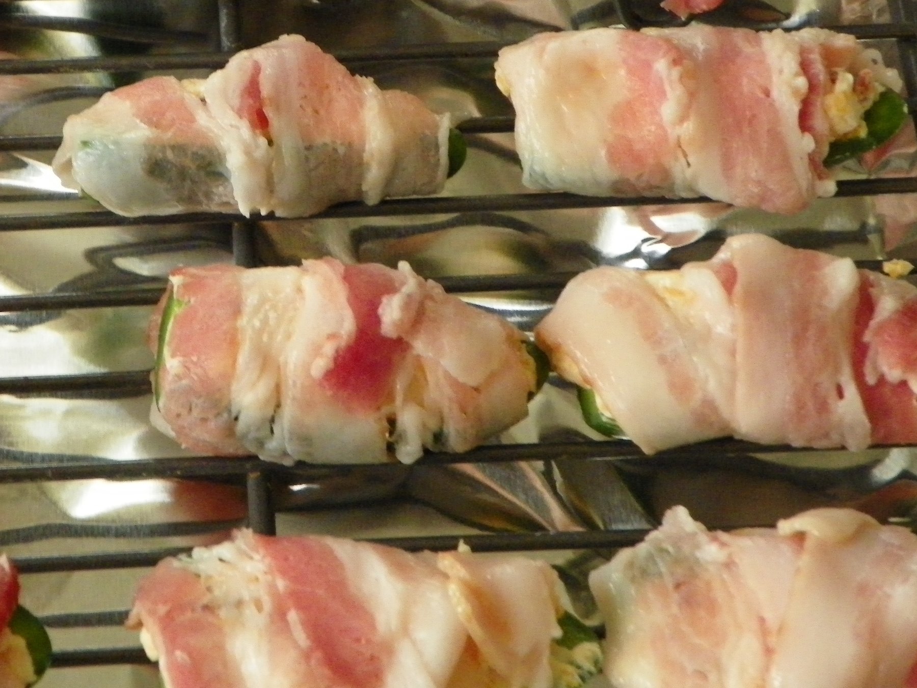 Jalapenos stuffed with cheese and wrapped in bacon!