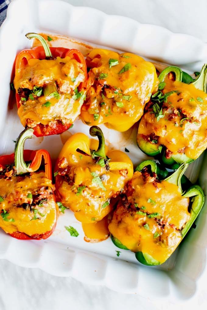Learn to make the best Stuffed Peppers. This healthier stuffed bell peppers recipe uses ground chicken or turkey, and whole grain rice, and is topped with a melty layer of cheddar!