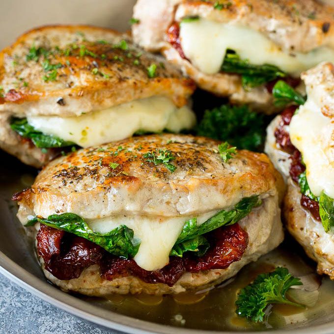These stuffed pork chops are boneless chops filled with spinach, sun dried tomatoes and mozzarella cheese, then seared to golden brown perfection. An easy dinner option that's quick enough for a weeknight, yet elegant enough for entertaining!