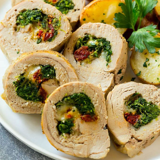 This stuffed pork tenderloin is filled with spinach, cheese and sun dried tomatoes, then rolled up and roasted to perfection. An elegant meal that's actually quite simple to make!