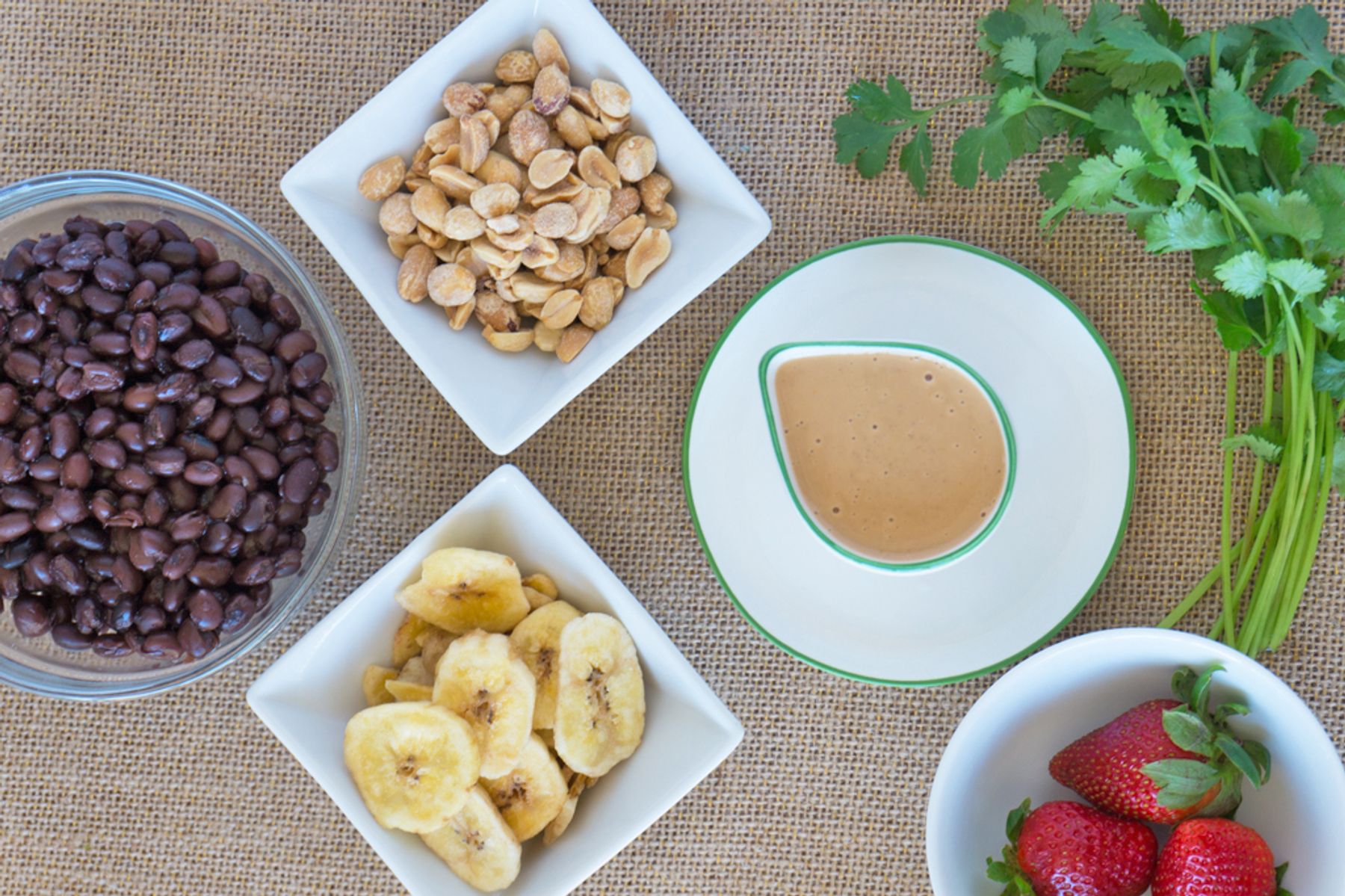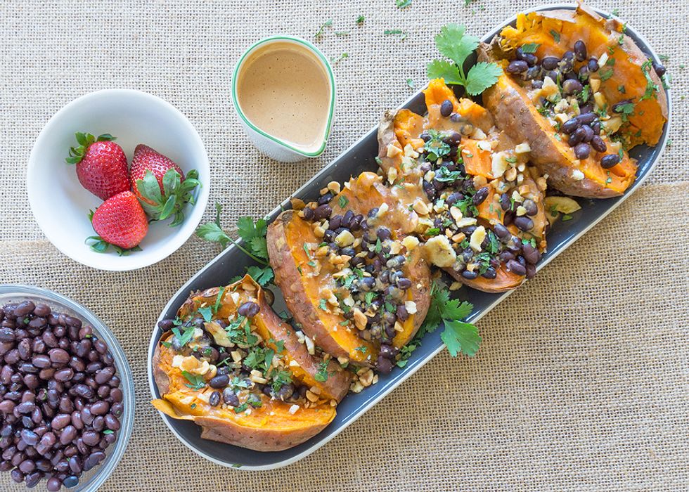 For these baked & stuffed sweet potatoes, I added black beans, cilantro, a drizzle of peanut sauce + some crushed peanuts, banana chips & a squeeze of lime. Sweet potato bliss!