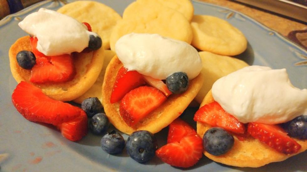 Sugar cookie shells with fresh fruit and whipped cream.
