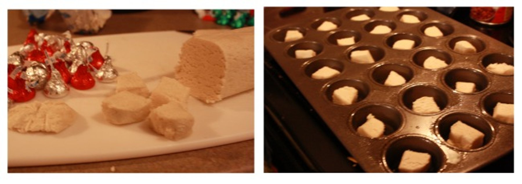 Cut your sugar cookie dough in rows about an inch thick. Then cut each inch thick circle into 4th's. Grease a mini muffin pan. Place the small pieces of dough in the mini muffin pan. Bake at 350 degrees for...