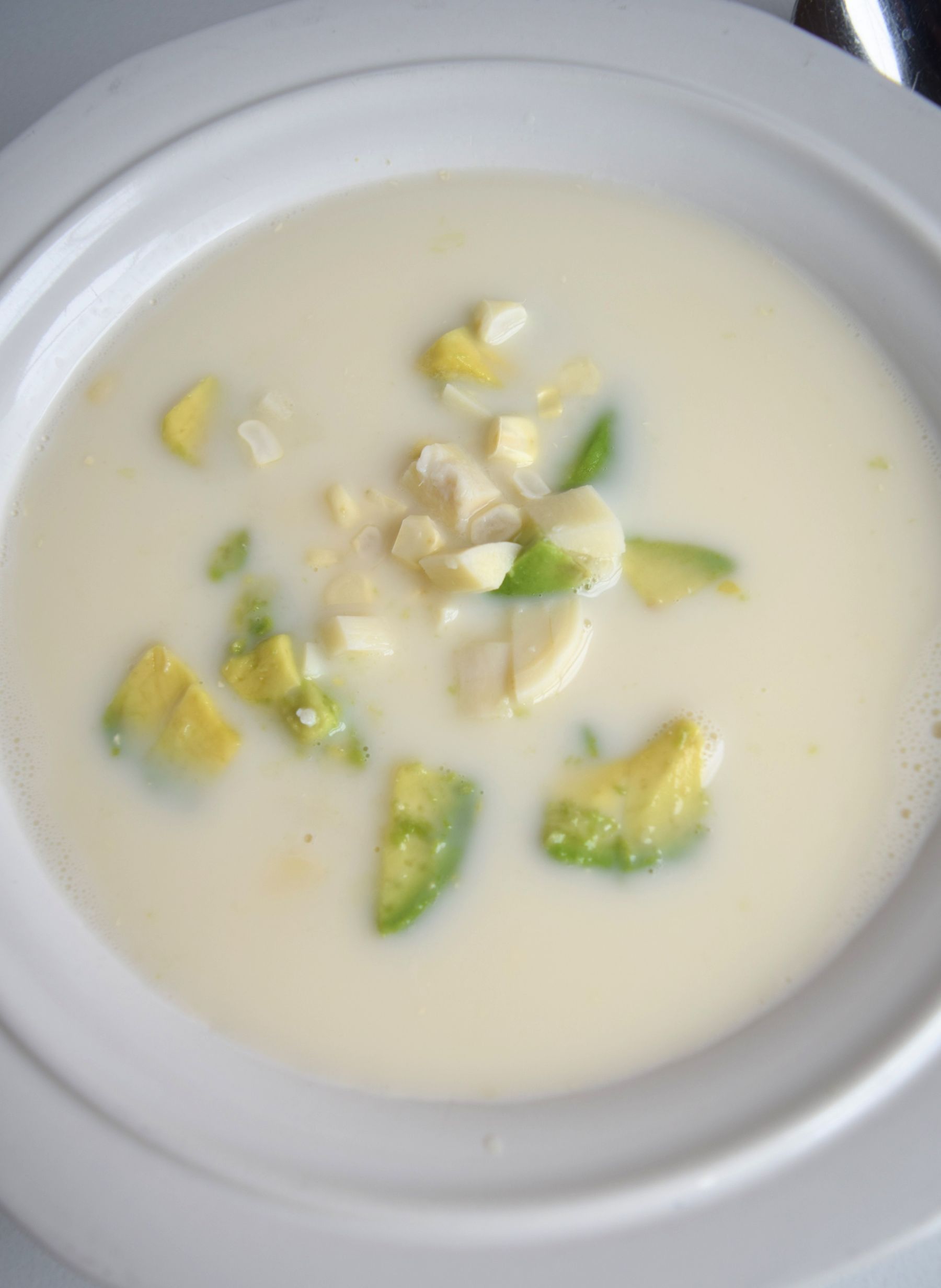 Cold corn soup garnished with corn, heart of palm, and avocado