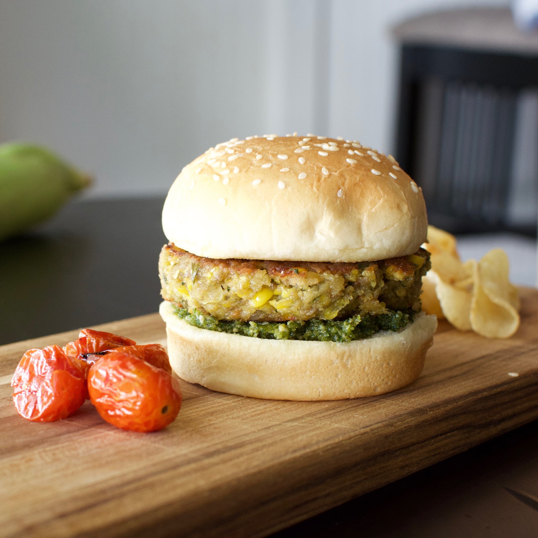 Summer Corn Veggie Burgers with Sunflower Seed Pesto