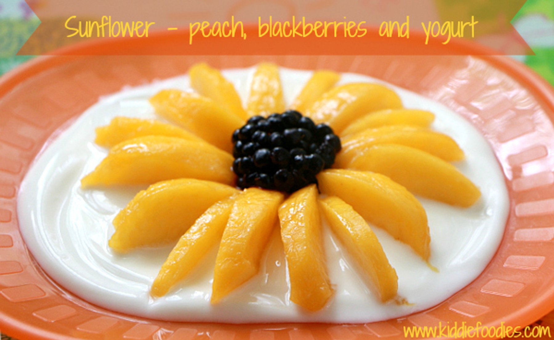 Desserts Sunflower - peach, blackberries and yogurt Gosia LamdaouarAugust 27, 2013 41 Simple to make, healthy and funny dessert for kids. It is made from a peach, blackberries and yogurt, presented as a sunflower. Who wouldn't love to eat it?