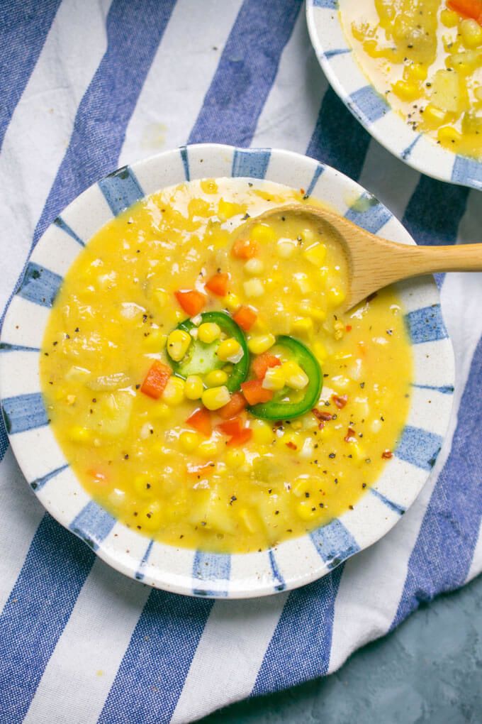 Prep your corn by removing the husks. Scrape off the kernels into a bowl, scraping close to the cob. Reserve the corn cobs and discard the husks. In a soup pot, heat the olive oil over medium heat. Add...