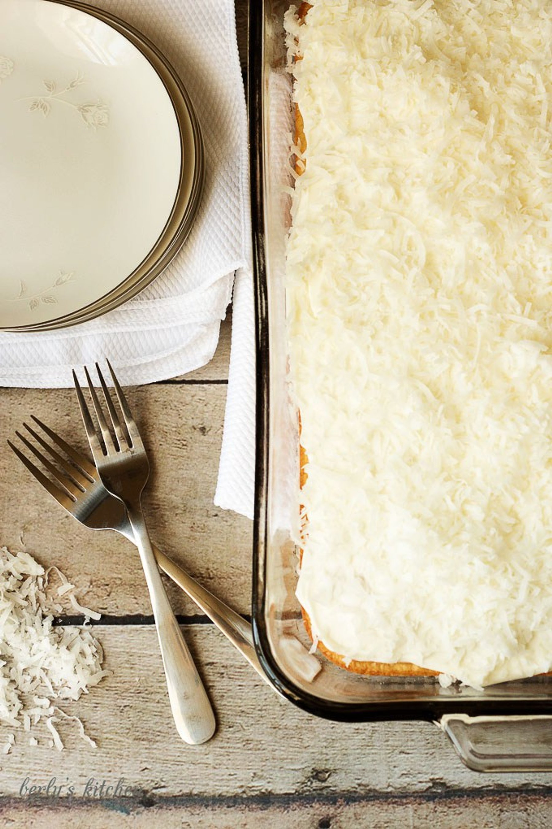 Grandma’s super simple coconut cake is one of our favorite recipes. A moist french vanilla cake topped with cream cheese frosting and shredded coconut.