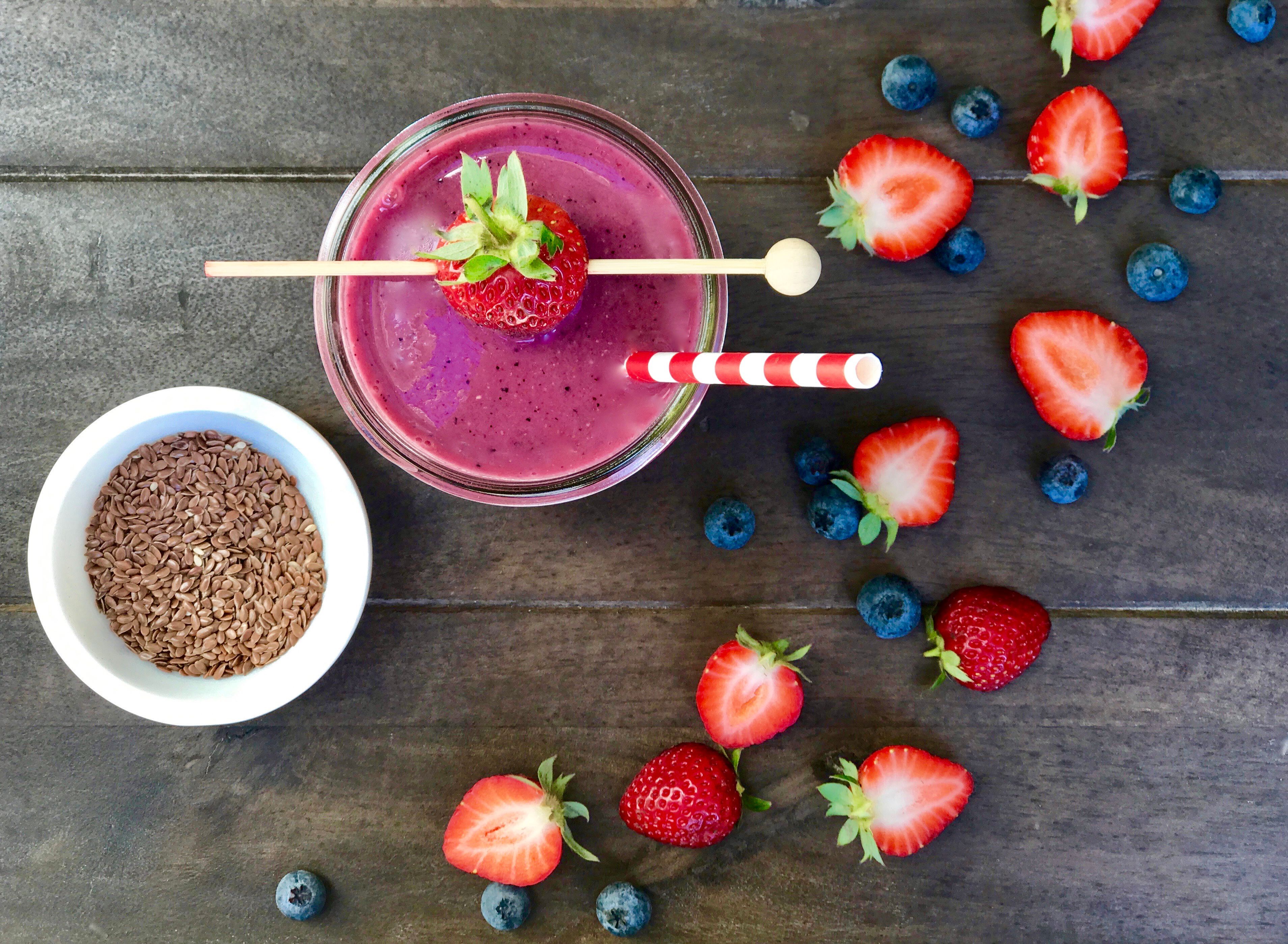 Using a kitchen blender, add the beets, strawberries, blueberries, almond milk, protein powder, flax seeds, honey and ice and mix on high for 1 minute to incorporate.