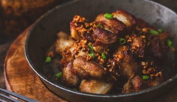 - Cut the pork chops into bite-sized pieces and render the fat in a hot pan.