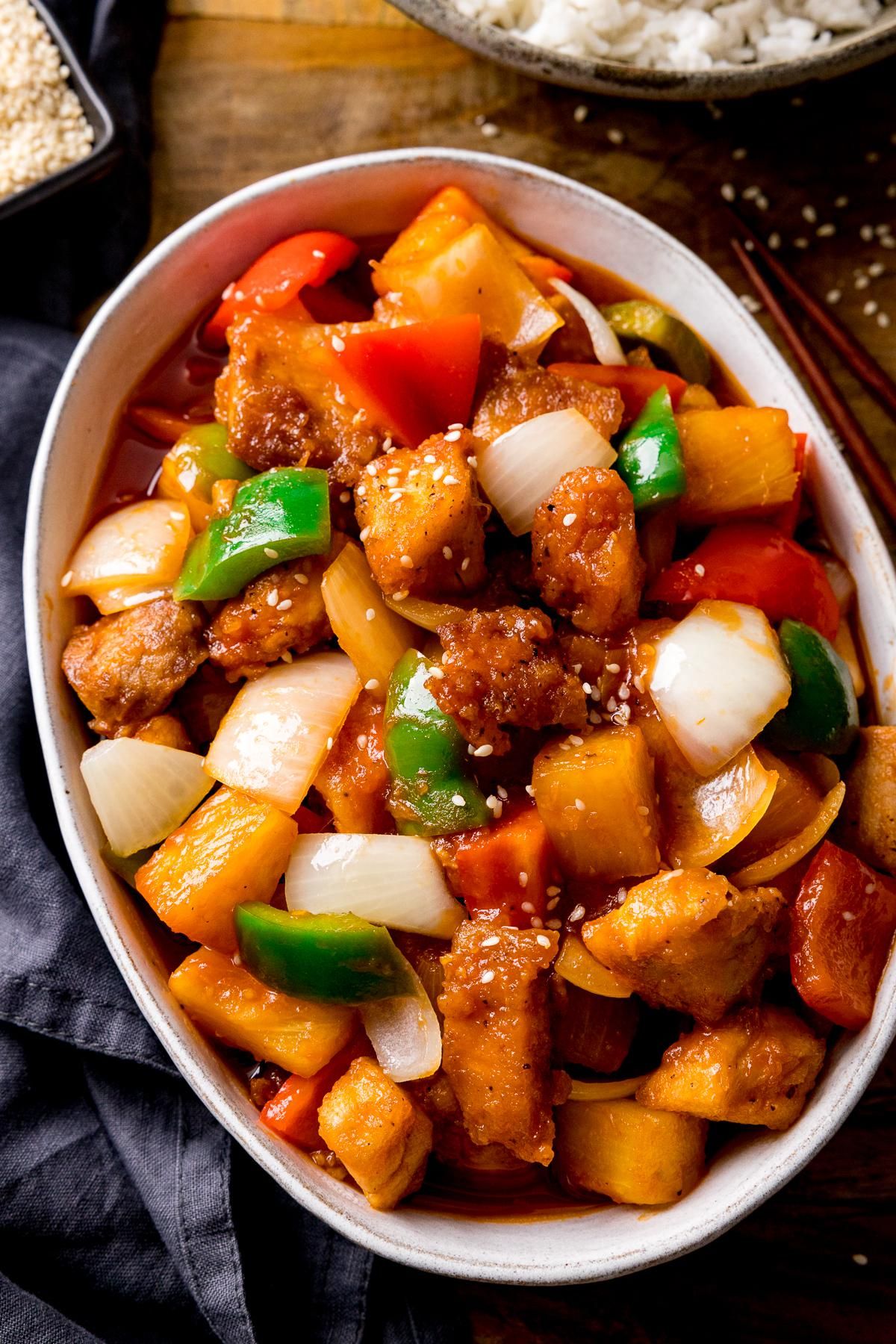 Sweet and Sour Turkey Nicky CorbishleyDecember 28, 2020 44 Kitchen SanctuaryLeftover turkey in a light, crispy coating, tossed together with a classic sweet and sour sauce, plus crunchy peppers and onions.Sweet and Sour TurkeySee the full directions on my site