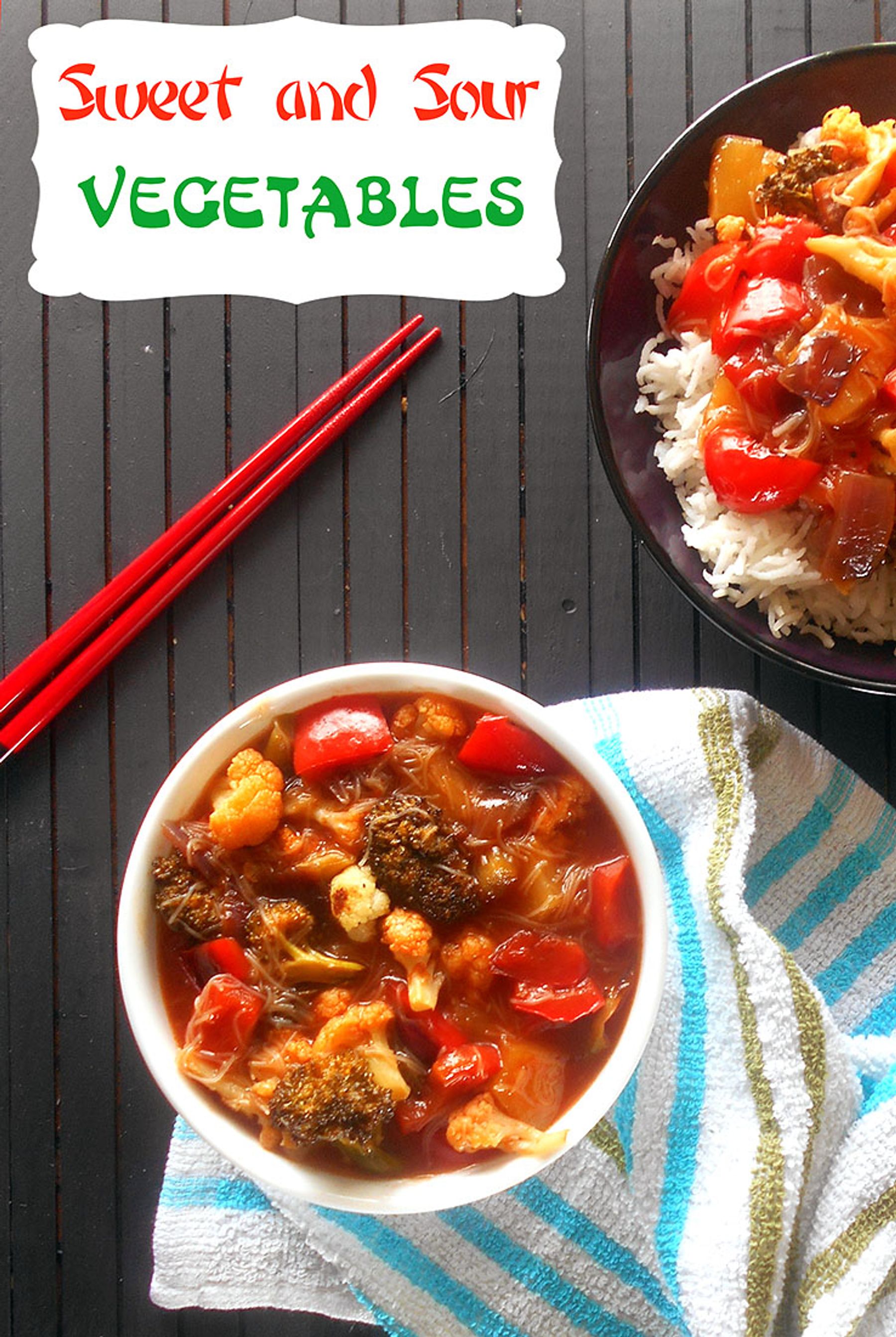 Sweet and Sour Vegetables made Chinese Style. Made with Roasted Cauliflower, Broccoli and Pineapples. I used Red Bell Peppers which add a wonderful crunch to this recipe. Quick 45 Minute meal for the whole family. This is a healthy and hearty dinner meal.