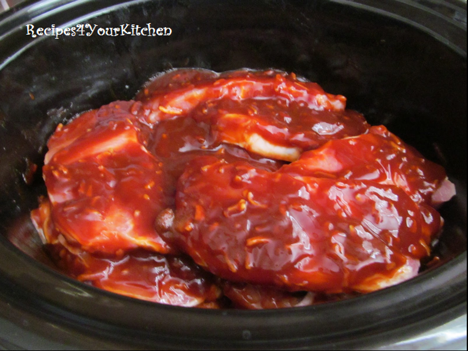 Place porkchops in crockpot sprayed with nonstick cooking spray. Mix up remaining ingredients and pour over porkchops. Since there were 8 I had layers, so I lifted the meat to make sure each piece had some sauce on it. Cook for 6-8 hours on Low or 4-6 hours on High. If your meat is frozen, like mine partially was, you need to adjust your cooking time.' If you add vegetables and you like them soft - like my family - the Low setting for a longer time produces better results.