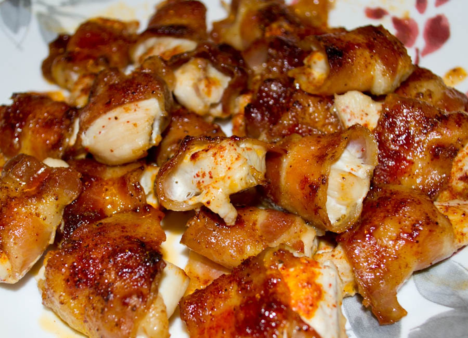 Cut chicken into 1 inch or so cubes. Then cute bacon strips into thirds. Wrap each piece of chicken with a piece of bacon. Combine brown sugar and chili powder then dredge chicken in the mix. and place in...