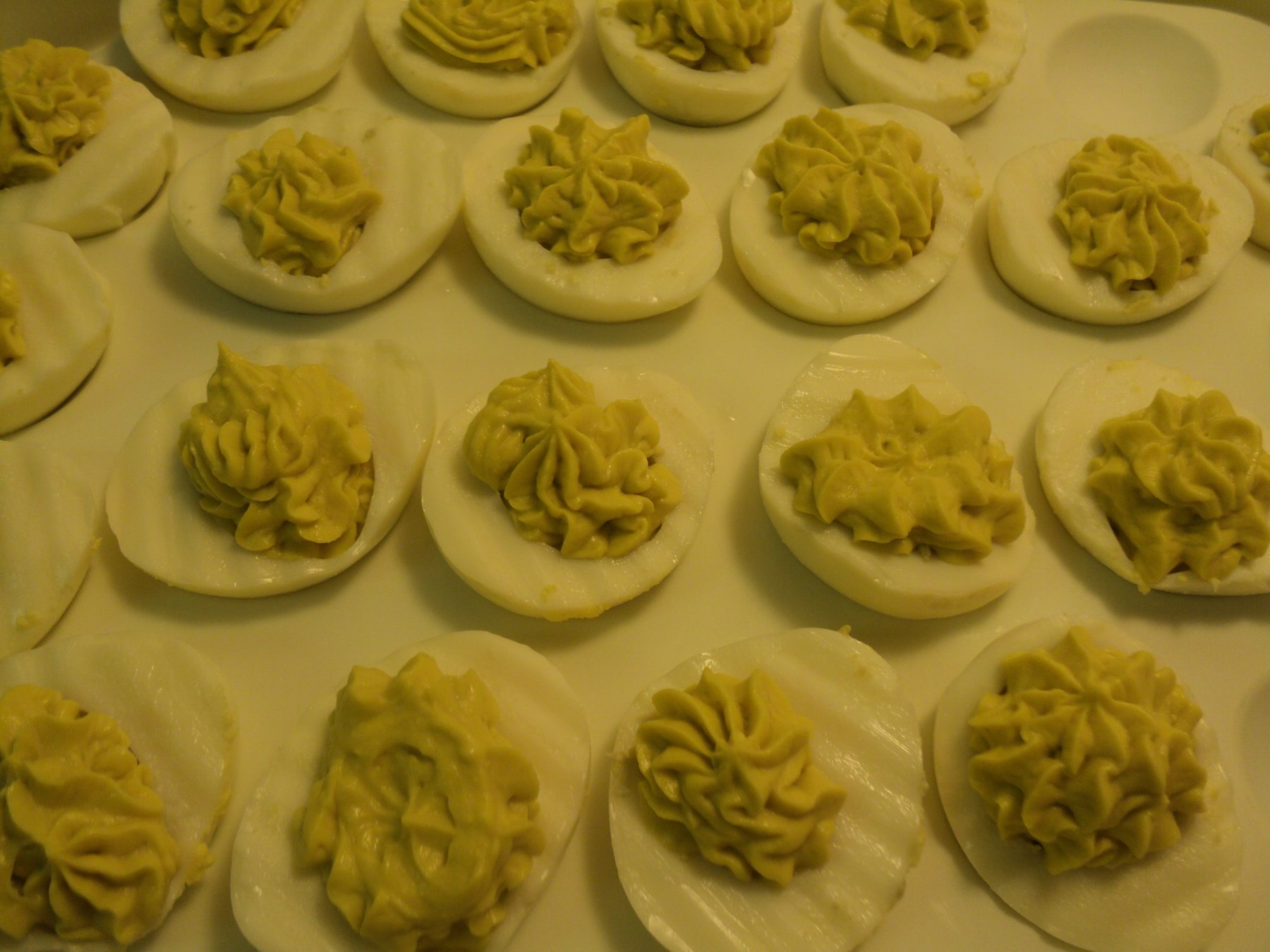 1 dozen eggs- hard boiled, peeled, and sliced in half length wise