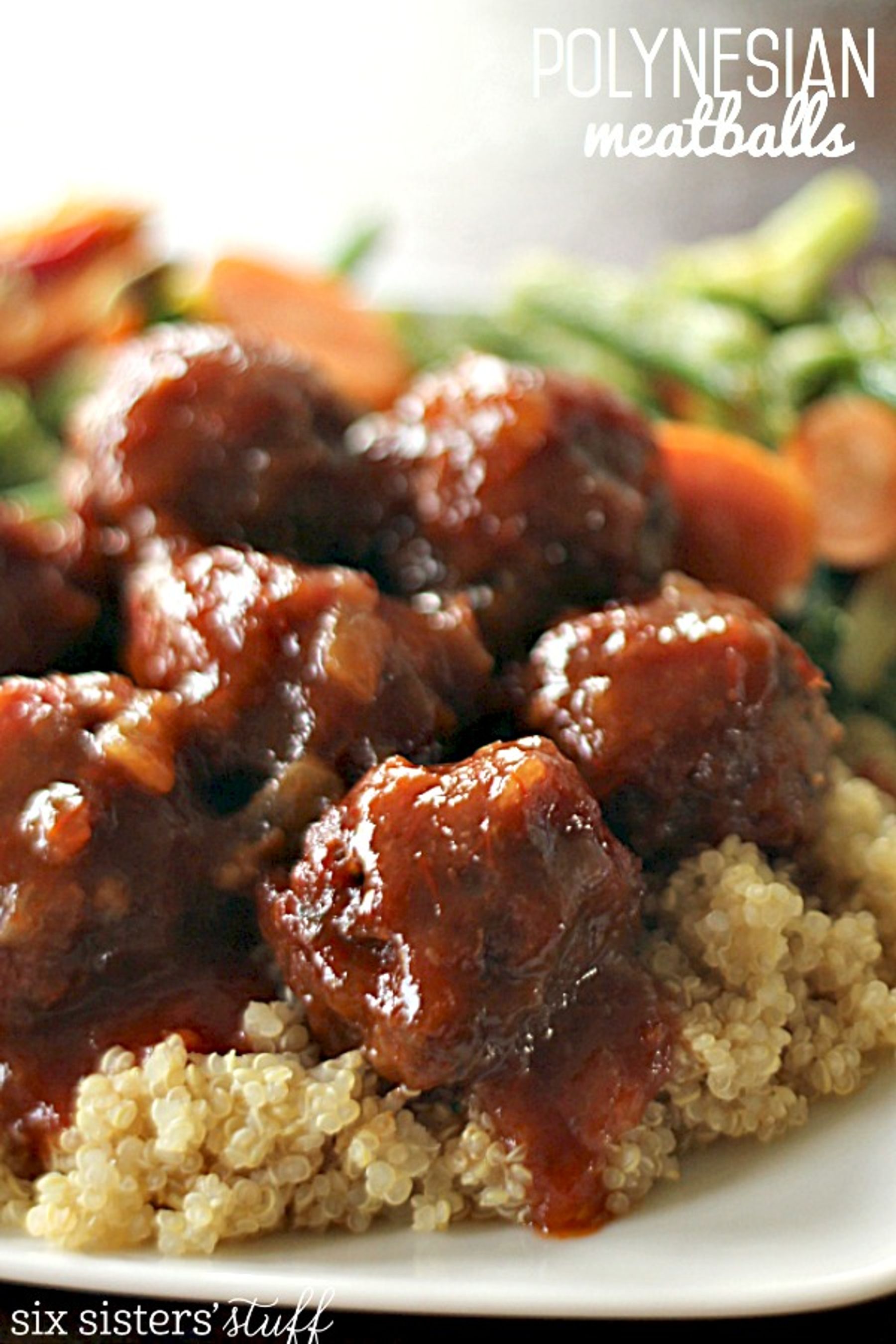 The meatballs are then topped with a sweet, sticky sauce (made of surprise ingredients – grape jelly?! Who would have thought?!) and baked until they are cooked all the way through. We put our meatballs on top of quinoa, but you could put them over rice or even poke a toothpick in them and serve as an appetizer!