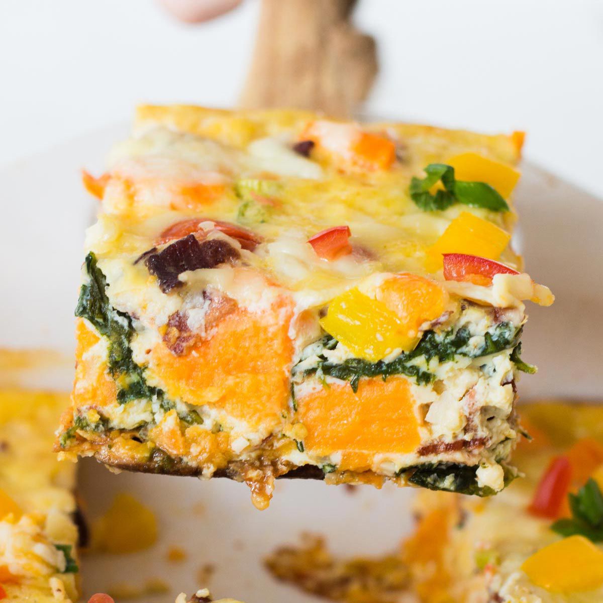 This healthy Sweet Potato Breakfast Casserole with eggs, bacon, veggies and spinach is a perfect way to feed a crowd during the holidays.