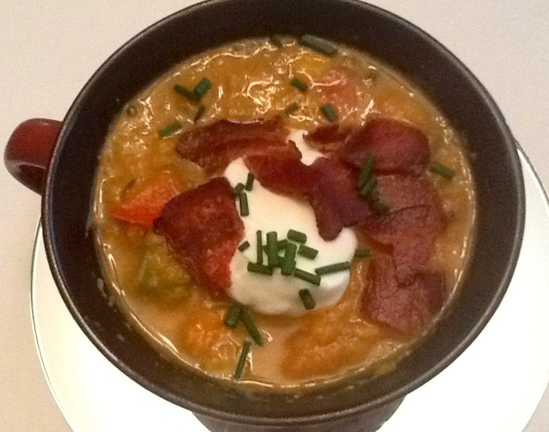 In a large pot on med heat add olive oil potatoes.stir until slightly coloured,add peppers,onions,celery and flour.stir to coat flour on veg.Add cream,stock,corn and seasonings.Simmer for 45 to 60 min on low or until all veg are soft.it will be slightly chunky,If you want it smoother you can mash it down a bit until your desired consistancy.