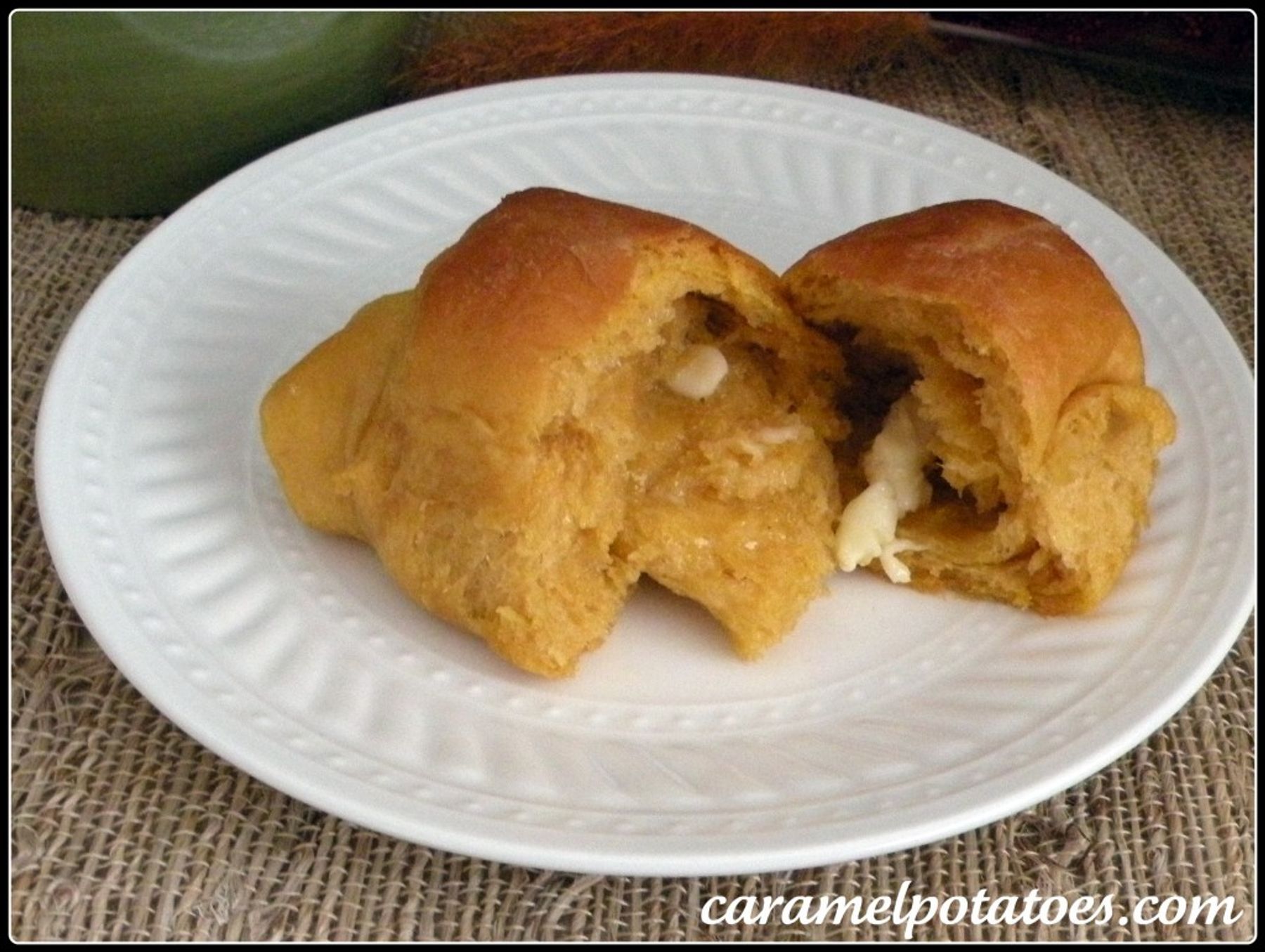 Do your kids always eat all their vegetables? Do they always tend to eat whatever has the most carbs? {Okay, this last one might not just be the kids.} Well, this is exactly what happens at my house. It’s so funny how they can eat the bread/rolls {more than what I would have thought humanly possible} and then as soon as they are told to eat something with a little more nutritional value they are full. Now the joke is on them! All they see is a roll, but inside is sweet potato puree. So