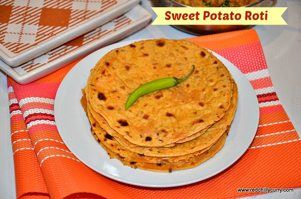Nutritious sweet potato is mashed and added to wheat flour and made into a flatbread or roti.