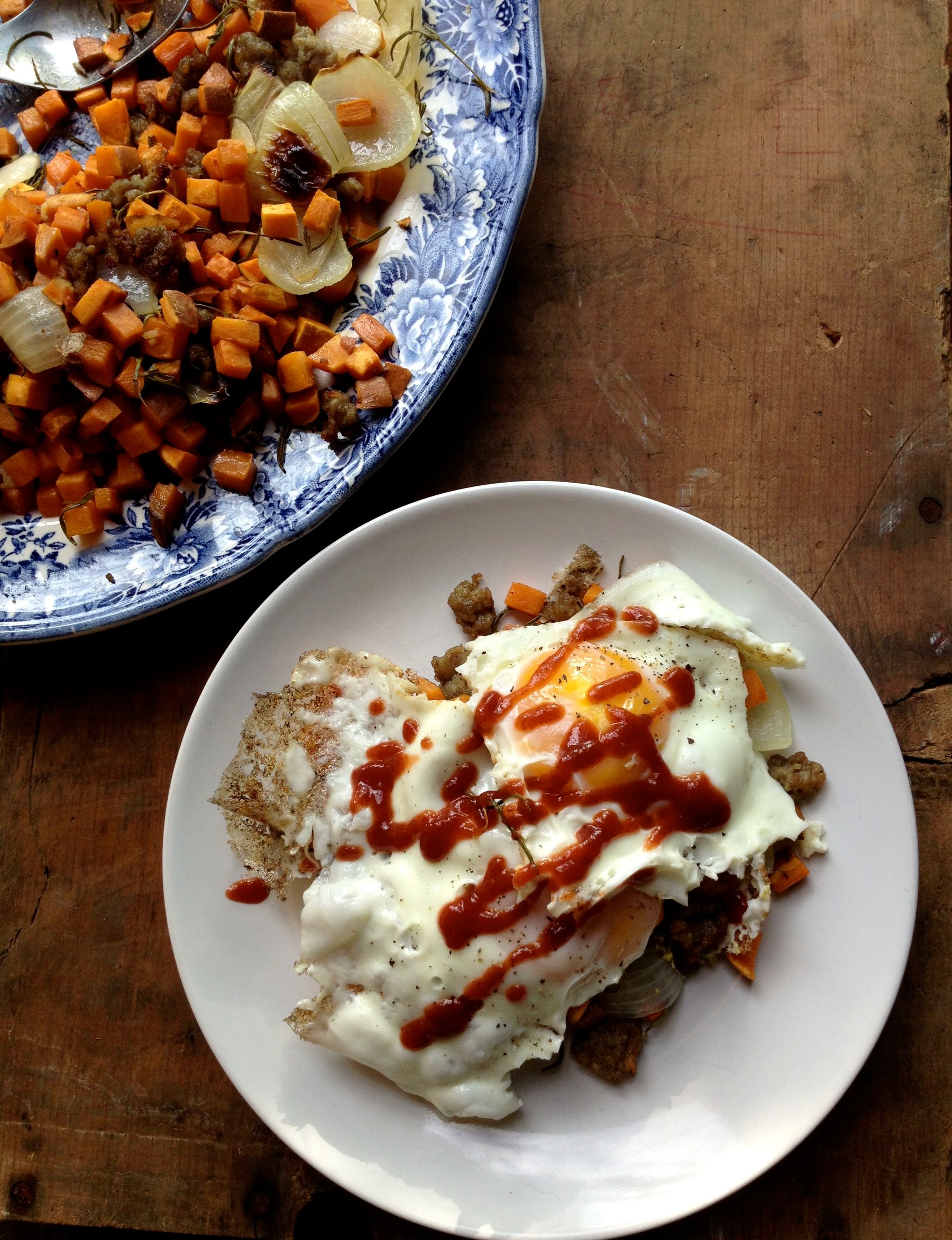 Sweet Potato Hash with Caramelized Onions, Rosemary, Sausage, & Eggs