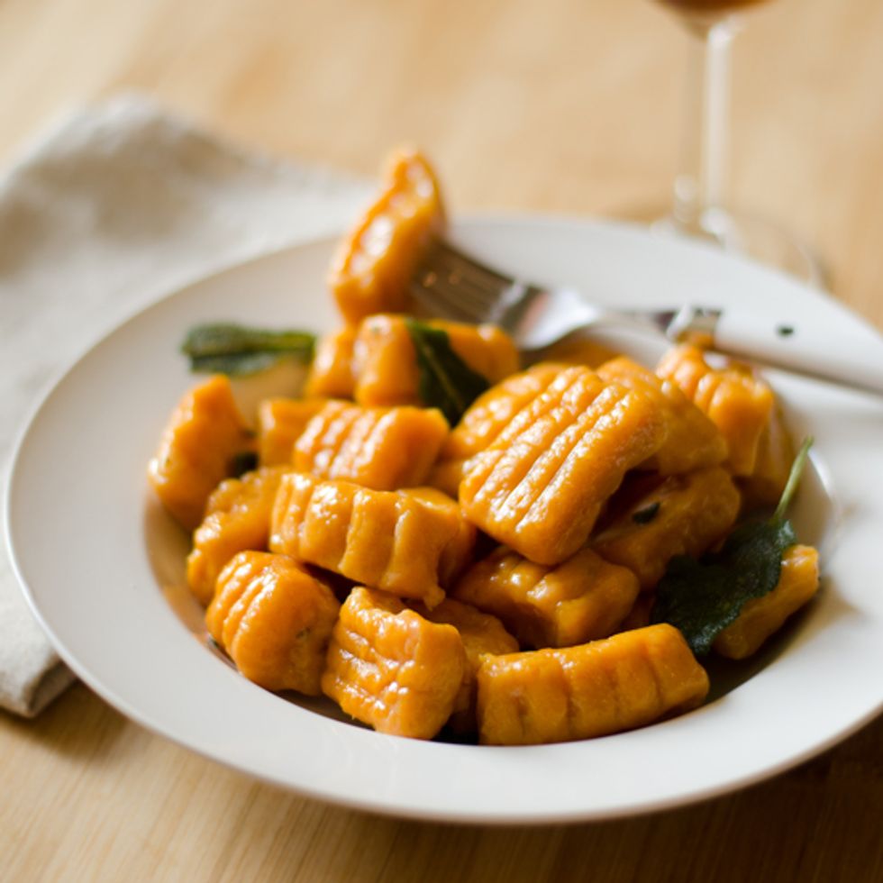 Tender sweet potato pumpkin gnocchi with crispy sage and a goat cheese cream sauce