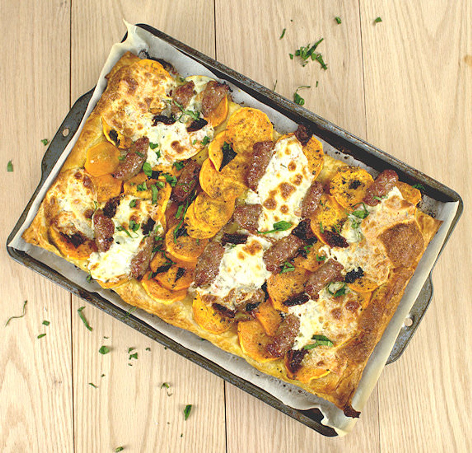Sweet Potato Slab Pie with Sausage & Mozzarella