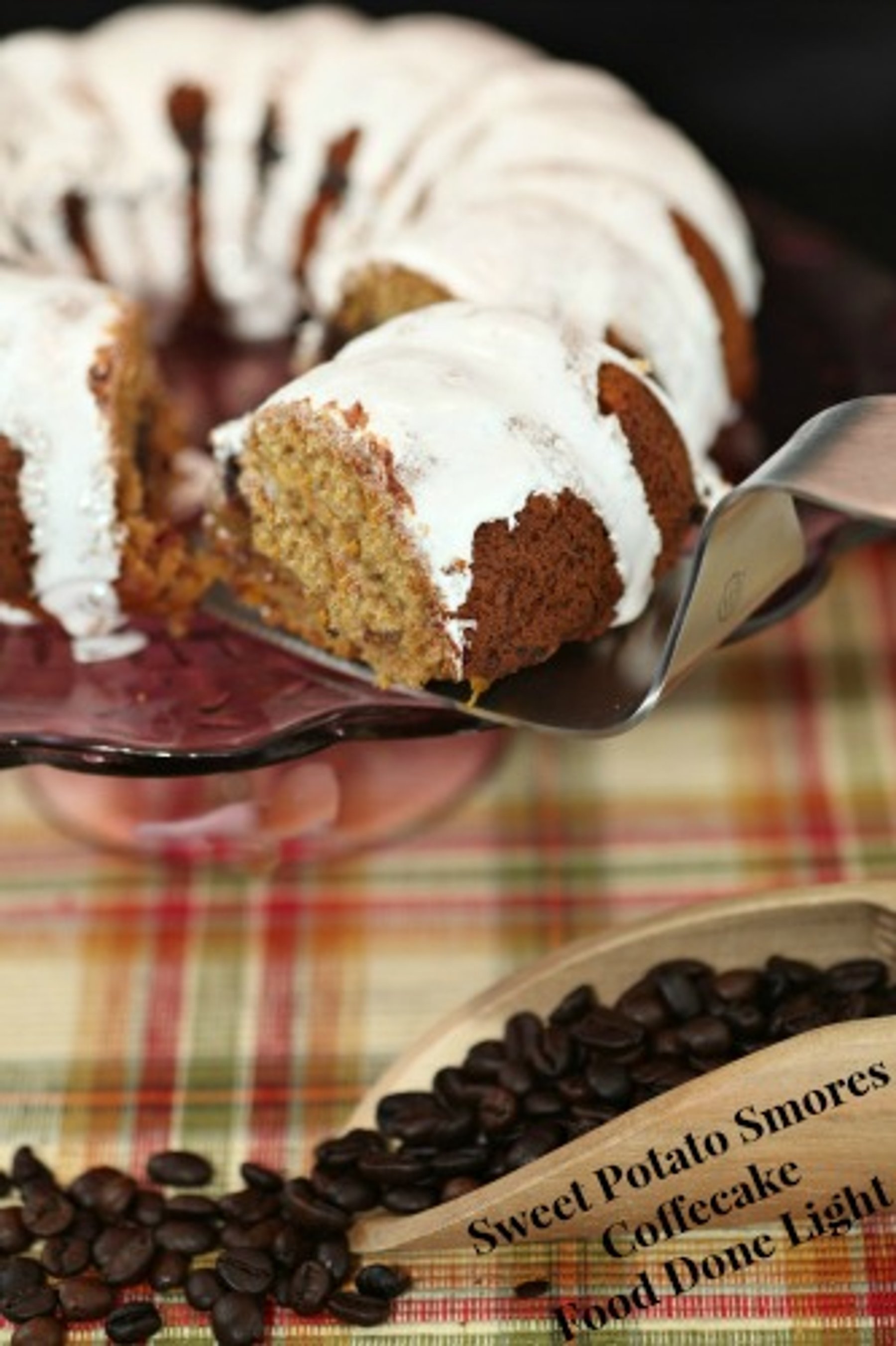 Moist and tender sweet potato coffeecake with chocolate and marshmallow glazes