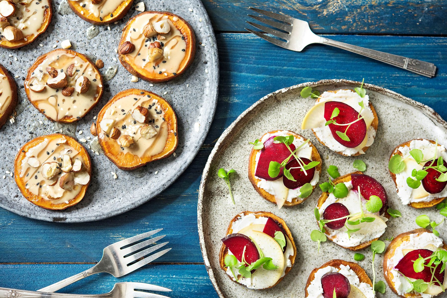 For sweet toasts, spread the tahini on each round, sprinkle crushed hazelnuts on top, drizzle with honey, and garnish with...