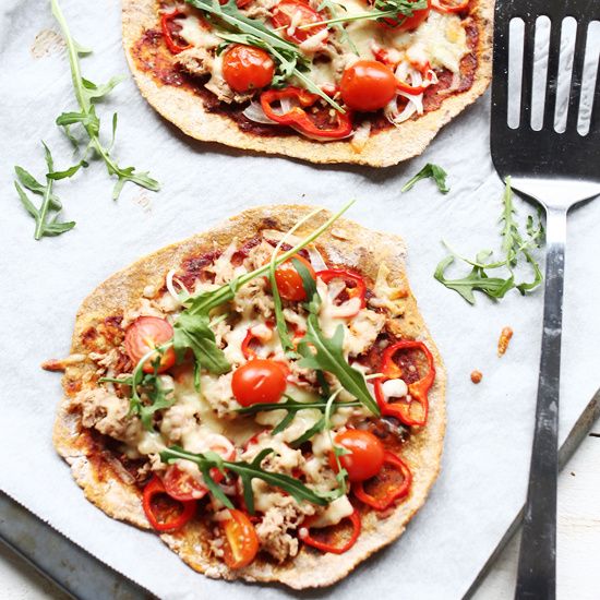 It is time for pizza. An easy pizza crust that you can make from a sweet potato flatbread and garnish with fresh vegetables, tuna and cheese.