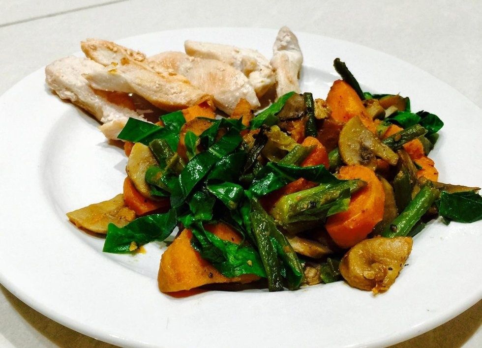 Sweet Potato with Mushrooms, Green Beans and Green Leaves