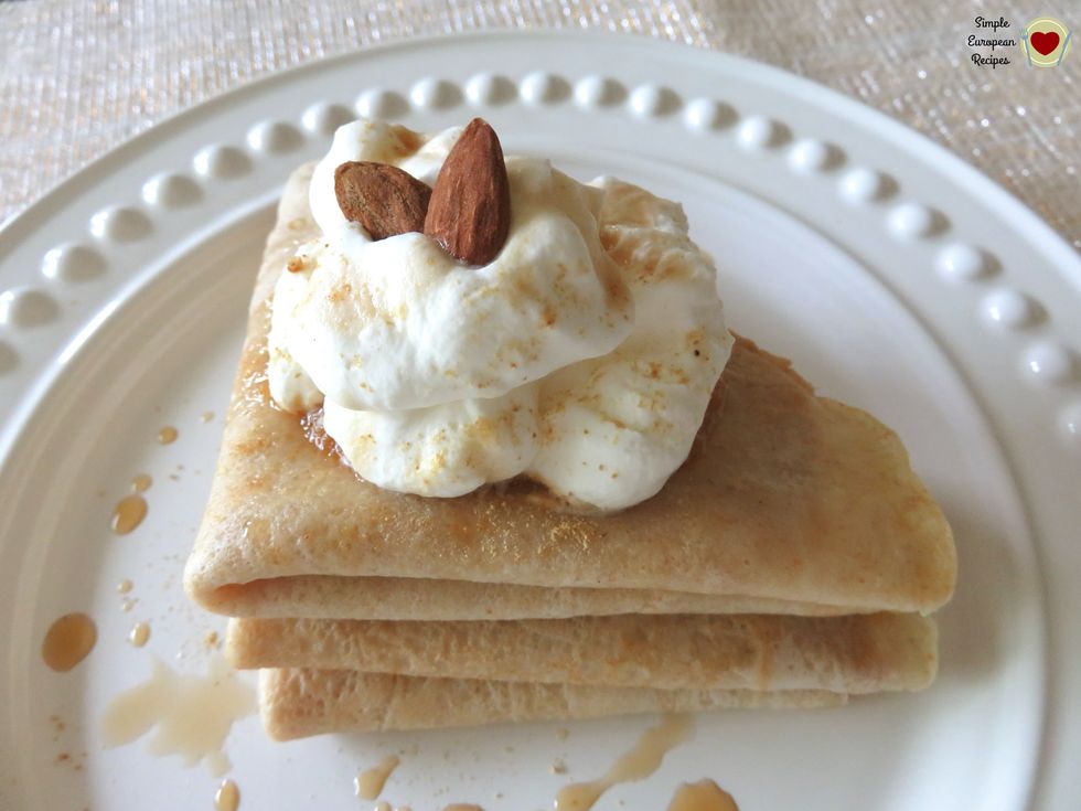 Thin pancakes filled with mashed pumpkin and apple, poured with maple syrup and decorated by whipped cream.