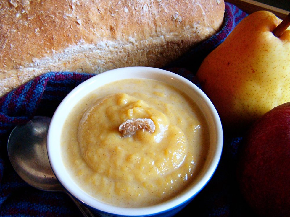 A creamy pumpkin [or winter squash] soup, sweetened with maple syrup. Fantastic for breakfast! [Your kids will never know how good for them this soup is!]