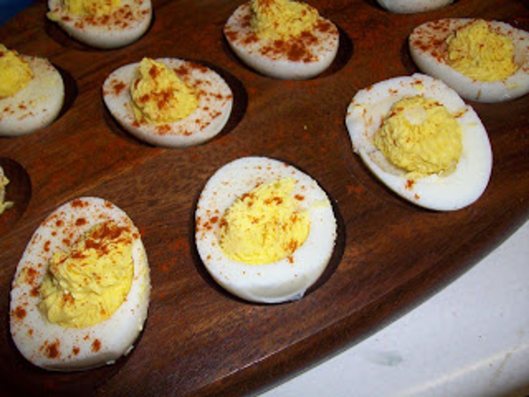 Cut eggs in half and remove yolks. Add remaining ingredients to the egg yolks. Mix well and put yolk mixture in a pipping bag and evenly add yolk mixture to the egg white shells, garnish with some paprika.