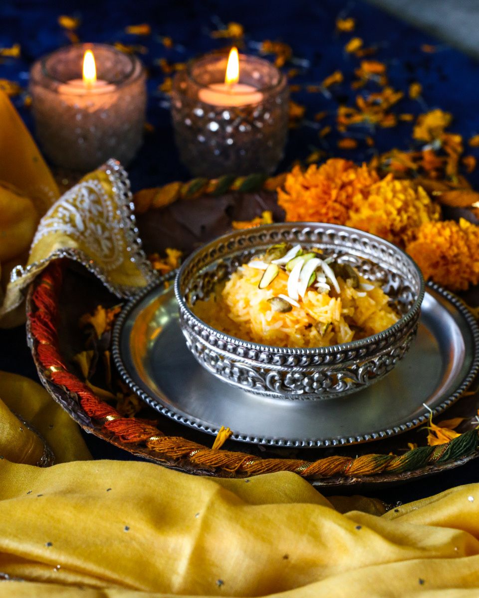 The word "zarda" is Persian for yellow, and this yellow rice gets its colour both from saffron as well as food colouring. Fragrant with the aroma of saffron, cinnamon, cloves, and cardamom carried through by the buttery ghee, and rich with almonds and pistachios, this is an easy traditional favourite! One of the simplest Indian sweets to experiment with.