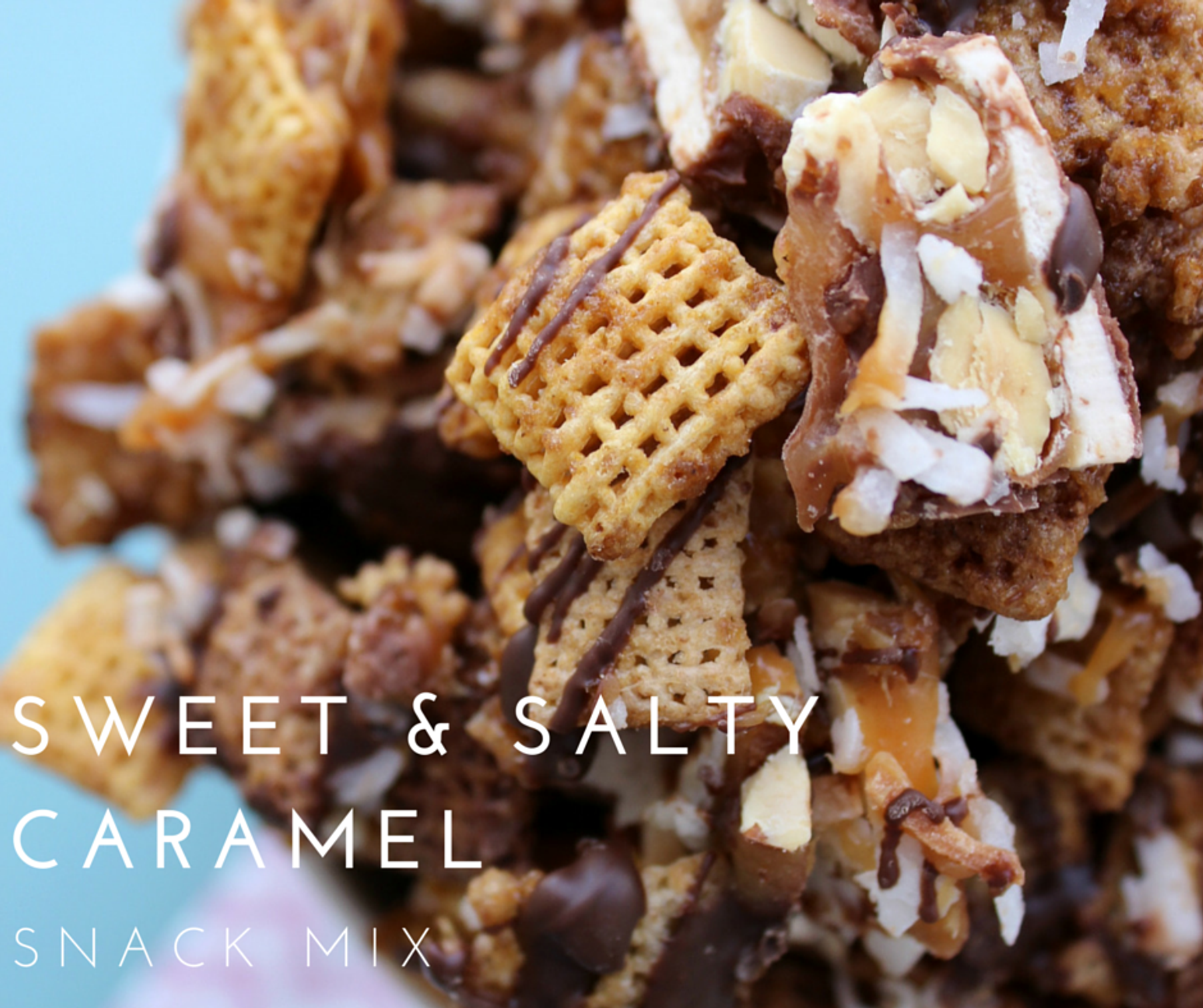 This Sweet and Salty Caramel Snack Mix has all my favorite snack flavors in one bite. Caramel, SNICKERS®, toasted coconut, chocolate & more caramel, this snack is seriously addicting.