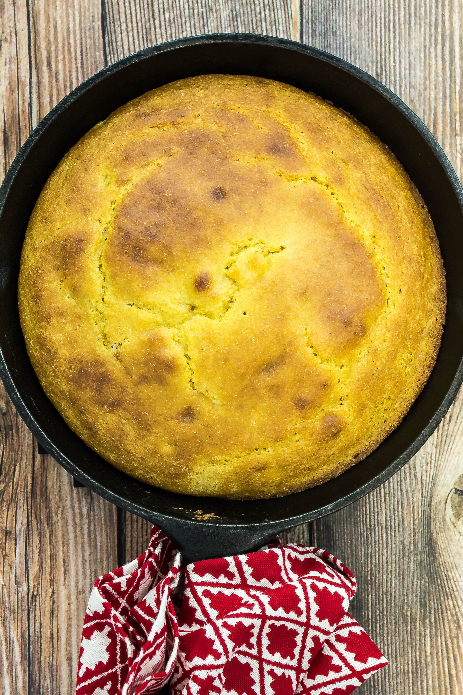 Sweet Skillet Cornbread-Healthy & delicious twist on traditional cornbread. Fluffy cornbread with a layer of corn kernels & a touch of sweetness is the perfect side for any gumbo, stew, or chili.