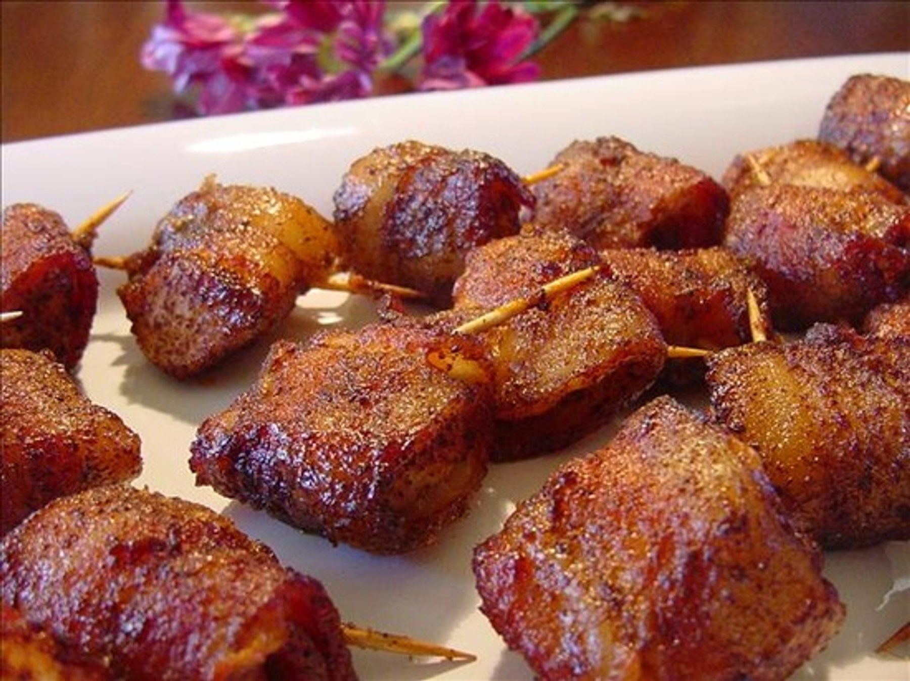 Bite-sized bits of chicken, dusted with brown sugar and chili powder, then wrapped in bacon, then dusted with brown sugar and chili powder again and baked in the oven!